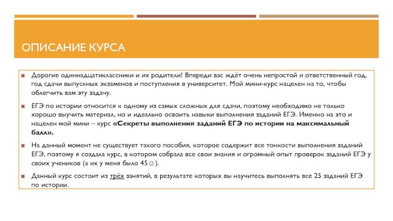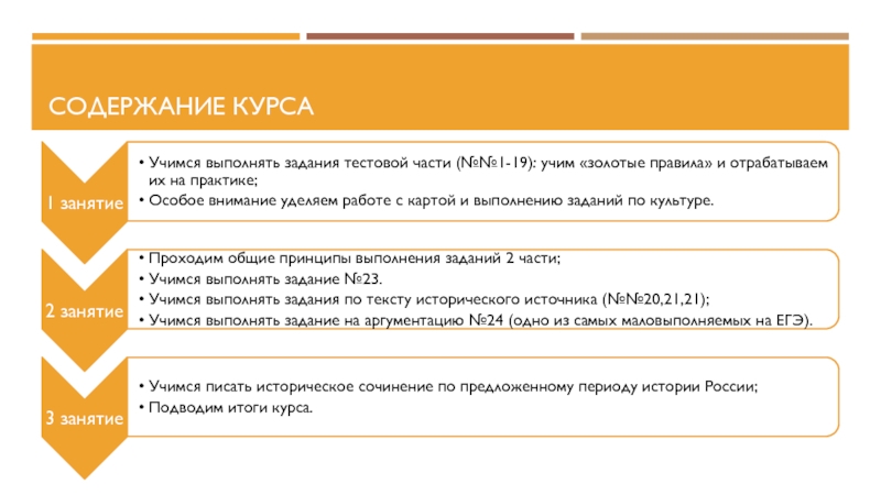Данный курс состоит из трёх занятий, в результате которых вы научитесь выполнять все 25 заданий ЕГЭ по истории.