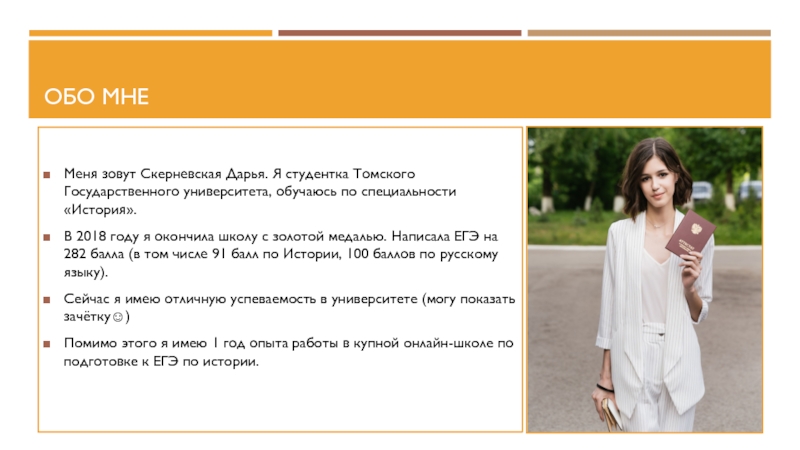 Обо мнеМеня зовут Скерневская Дарья. Я студентка Томского Государственного университета, обучаюсь по специальности «История».В 2018 году я окончила школу с золотой медалью. Написала ЕГЭ на 282 балла (в том числе 91