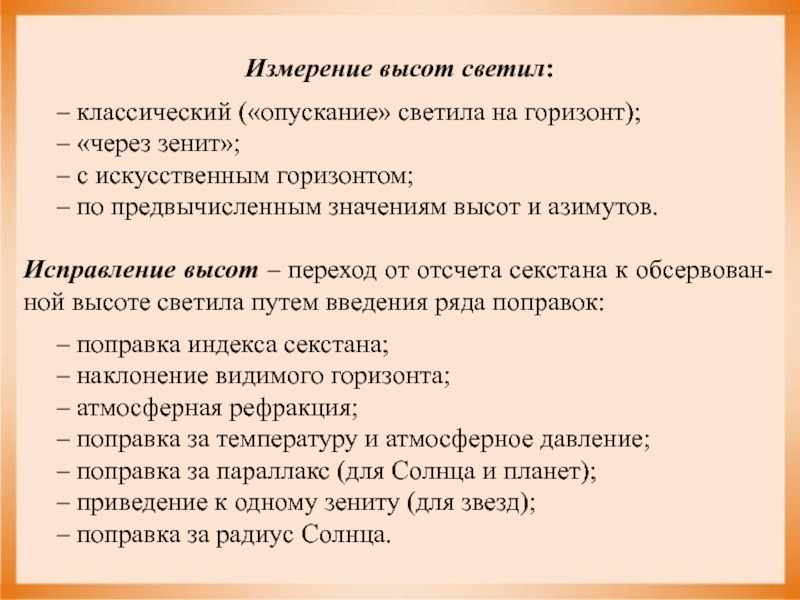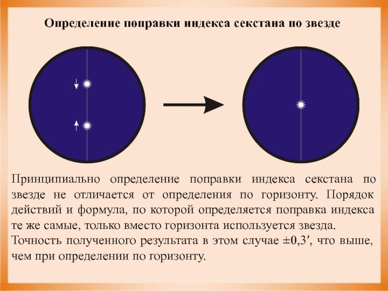При определении места судна астрономи-ческим способом совмещаются изображения видимого горизонта и наблюдаемого светила. Снимаемый отсчет секстана является основой для получения обсервованной высоты светила.