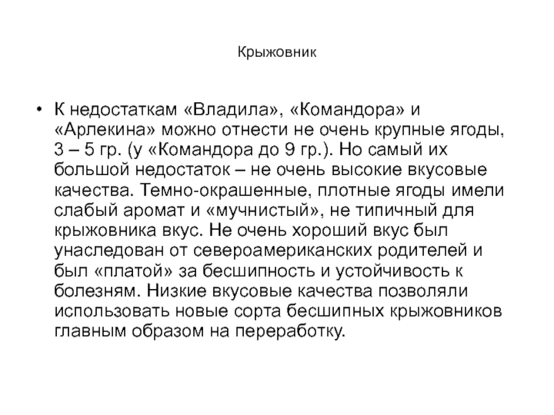 9 гр.). Но самый их большой недостаток – не очень высокие вкусовые качества. Темно-окрашенные, плотные ягоды имели слабый аромат и «мучнистый», не типичный для крыжовника вкус. Не очень хороший вкус был унаследован от североамериканских родителей и был «платой» за бесшипность и устойчивость к болезням. Низкие вкусовые качества позволяли использовать новые сорта бесшипных крыжовников главным образом на переработку.