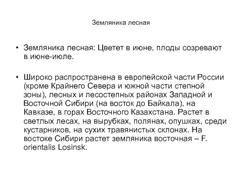 южной части степной зоны), лесных и лесостепных районах Западной и Восточной Сибири (на восток до Байкала), на Кавказе, в горах Восточного Казахстана. Растет в светлых лесах, на вырубках, полянах, опушках, среди кустарников, на сухих травянистых склонах. На востоке Сибири растет земляника восточная – F. orientalis Losinsk.