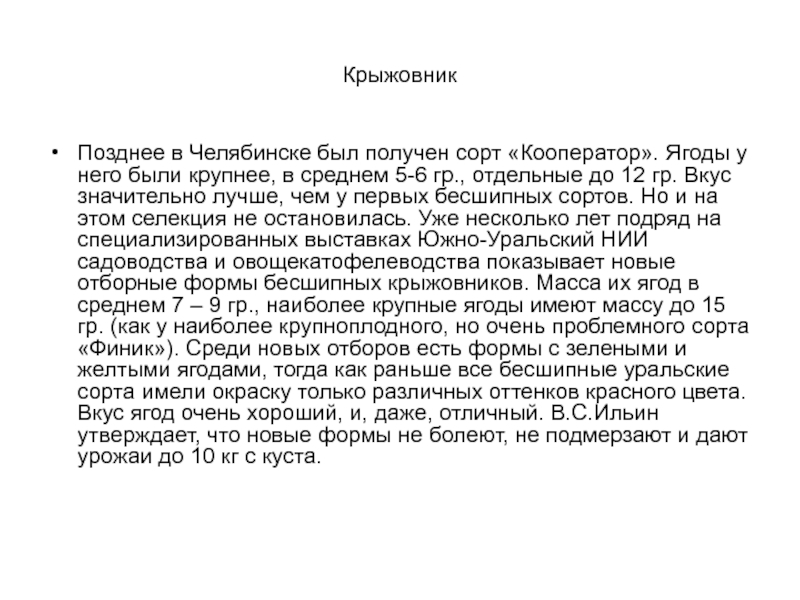 гр. Вкус значительно лучше, чем у первых бесшипных сортов. Но и на этом селекция не остановилась. Уже несколько лет подряд на специализированных выставках Южно-Уральский НИИ садоводства и овощекатофелеводства показывает новые отборные формы бесшипных крыжовников. Масса их ягод в среднем 7 – 9 гр., наиболее крупные ягоды имеют массу до 15 гр. (как у наиболее крупноплодного, но очень проблемного сорта «Финик»). Среди новых отборов есть формы с зелеными и желтыми ягодами, тогда как раньше все бесшипные уральские сорта имели окраску только различных оттенков красного цвета. Вкус ягод очень хороший, и, даже, отличный. В.С.Ильин утверждает, что новые формы не болеют, не подмерзают и дают урожаи до 10 кг с куста.