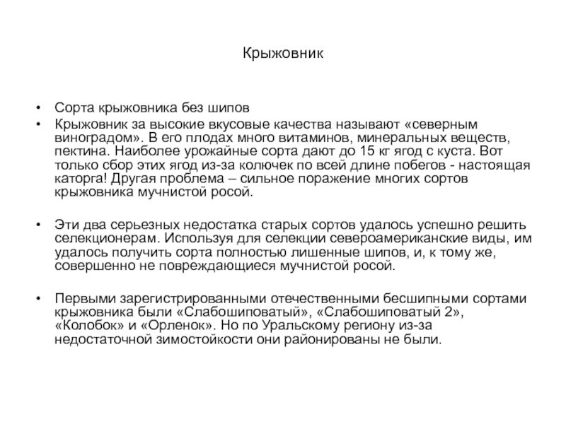 Первыми зарегистрированными отечественными бесшипными сортами крыжовника были «Слабошиповатый», «Слабошиповатый 2», «Колобок» и «Орленок». Но по Уральскому региону из-за недостаточной зимостойкости они районированы не были.