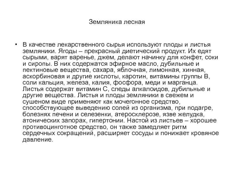 джем, делают начинку для конфет, соки и сиропы. В них содержатся эфирное масло, дубильные и пектиновые вещества, сахара, яблочная, лимонная, хинная, аскорбиновая и другие кислоты, каротин, витамины группы В, соли кальция, железа, калия, фосфора, меди и марганца. Листья содержат витамин С, следы алкалоидов, дубильные и другие вещества. Листья и плоды земляники в свежем и сушеном виде применяют как мочегонное средство, способствующее выведению солей из организма, при подагре, болезнях печени и селезенки, атеросклерозе, язве желудка, атонических запорах, гипертонии. Настой из листьев – хорошее противоцинготное средство, он также замедляет ритм сердечных сокращений, расширяет сосуды и понижает кровяное давление.