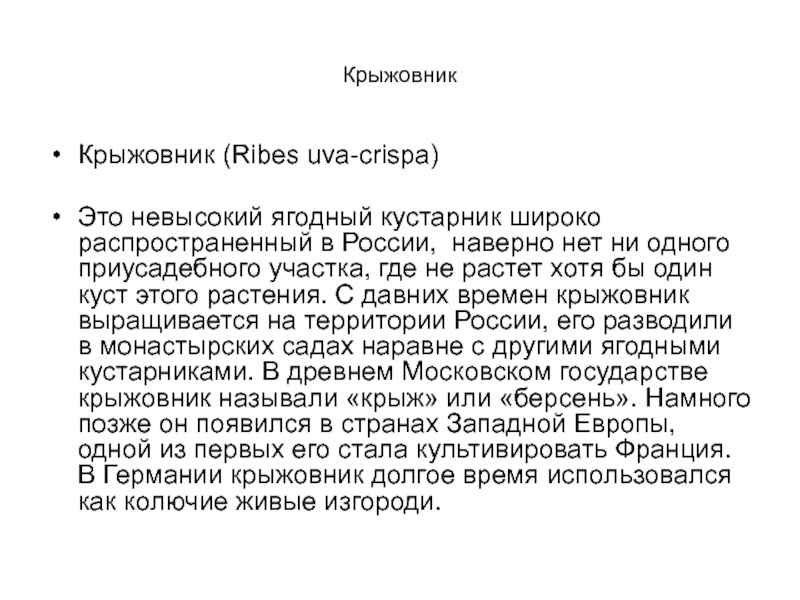 хотя бы один куст этого растения. С давних времен крыжовник выращивается на территории России, его разводили в монастырских садах наравне с другими ягодными кустарниками. В древнем Московском государстве крыжовник называли «крыж» или «берсень». Намного позже он появился в странах Западной Европы, одной из первых его стала культивировать Франция. В Германии крыжовник долгое время использовался как колючие живые изгороди.