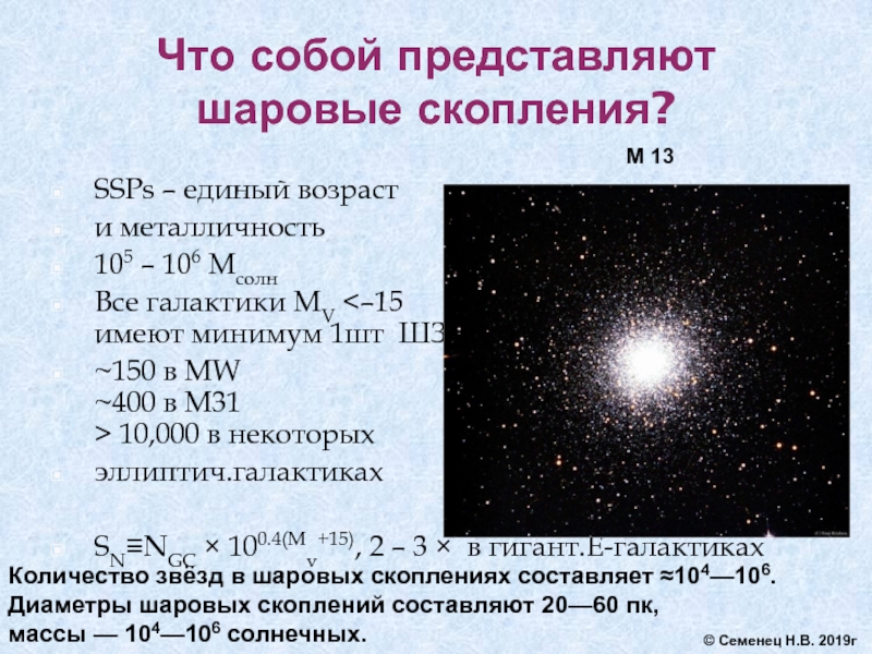Количество звёзд в шаровых скоплениях составляет ≈104—106. Диаметры шаровых скоплений составляют 20—60 пк,