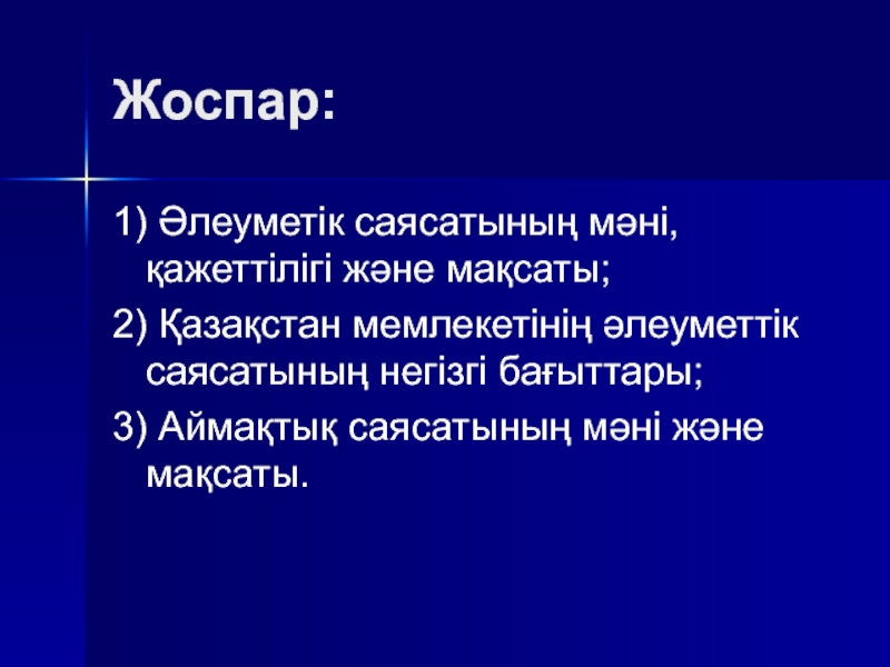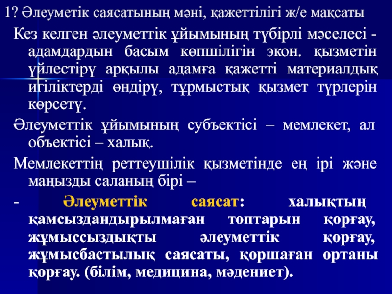 1) Әлеуметік саясатының мәні, қажеттілігі және мақсаты;