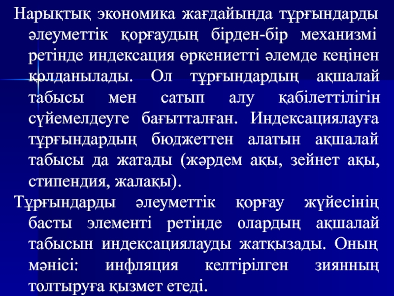 Слайд 8Нарықтық экономика жағдайында тұрғындарды әлеуметтік қорғаудың бірден-бір механизмі ретінде индексация
