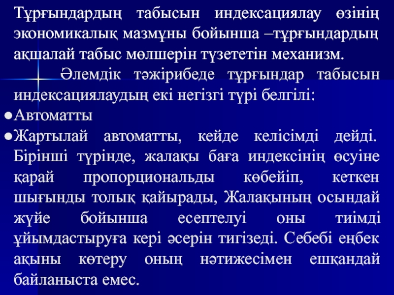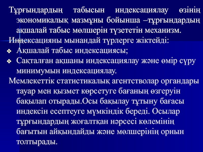 Слайд 10Тұрғындардың табысын индексациялау өзінің экономикалық мазмұны бойынша –тұрғындардың ақшалай табыс