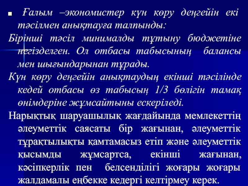 Слайд 13 Ғалым –экономистер күн көру деңгейін екі тәсілмен анықтауға талпынды: