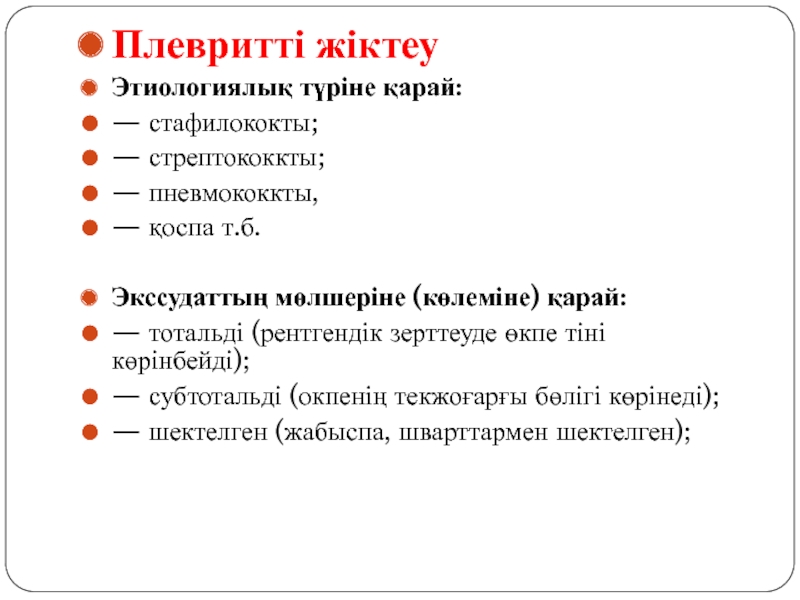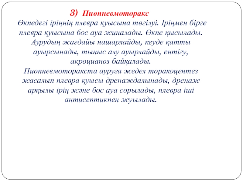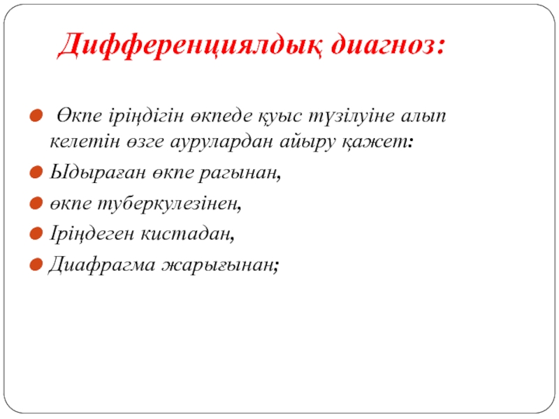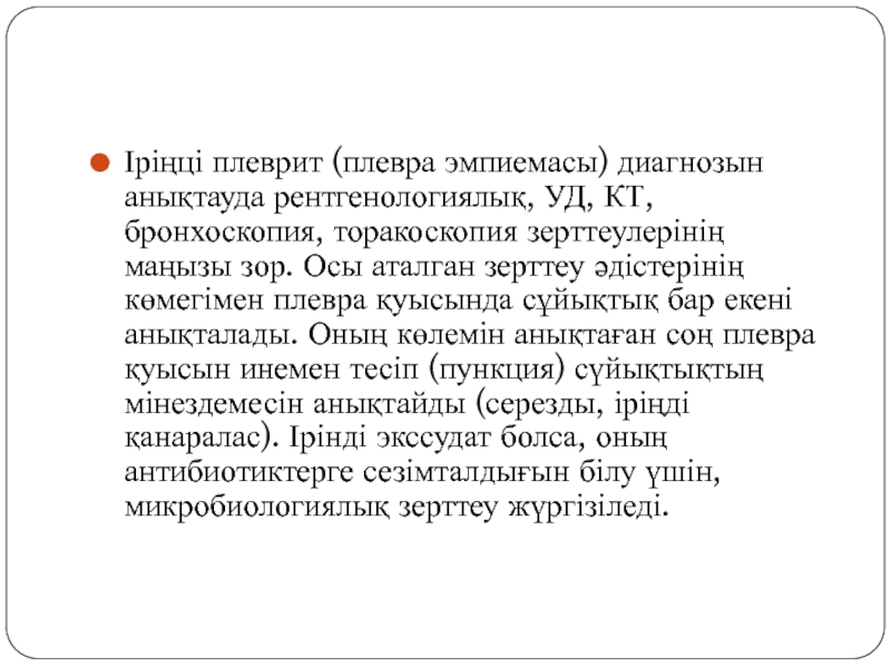 Слайд 50Іріңці плеврит (плевра эмпиемасы) диагнозын анықтауда рентгенологиялық, УД, КТ, бронхоскопия,