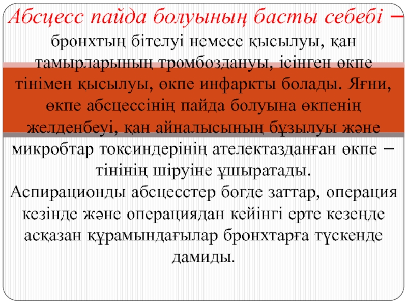 Слайд 5Абсцесс пайда болуының басты себебі – бронхтың бітелуі немесе қысылуы,