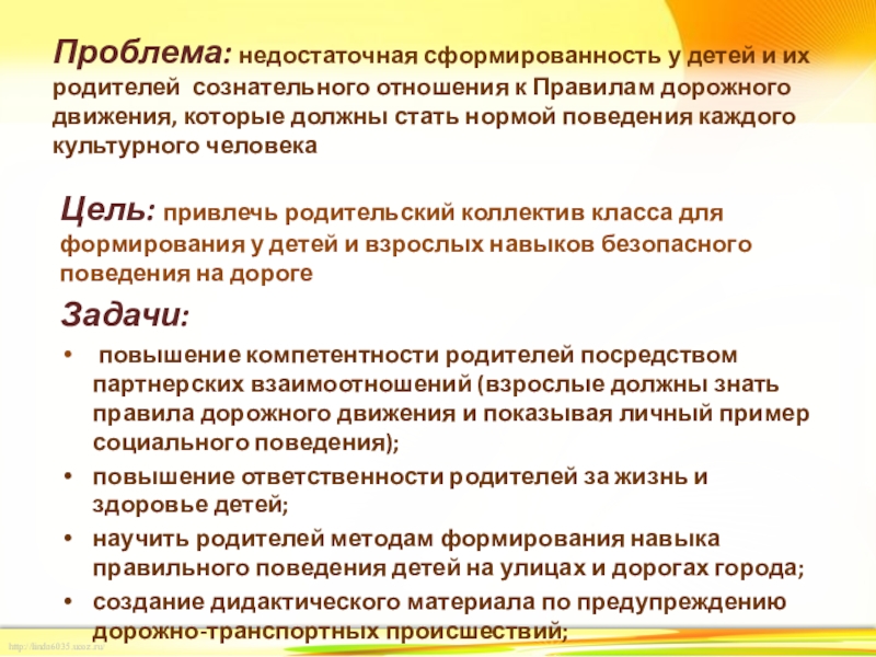 Цель: привлечь родительский коллектив класса для формирования у детей и взрослых навыков безопасного поведения на дороге