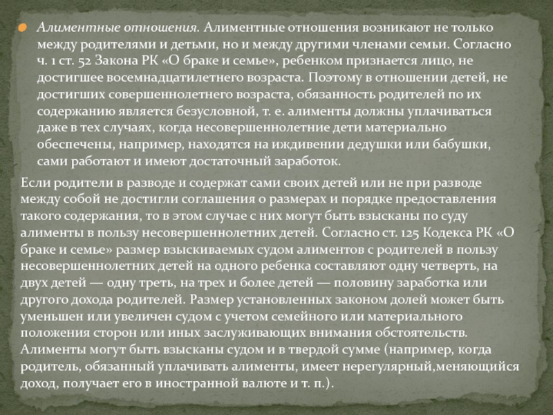 ст. 52 Закона РК «О браке и семье», ребенком признается лицо, не достигшее восемнадцатилетнего возраста. Поэтому в отношении детей, не достигших совершеннолетнего возраста, обязанность родителей по их содержанию является безусловной, т. е. алименты должны уплачиваться даже в тех случаях, когда несовершеннолетние дети материально обеспечены, например, находятся на иждивении дедушки или бабушки, сами работают и имеют достаточный заработок.