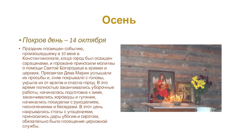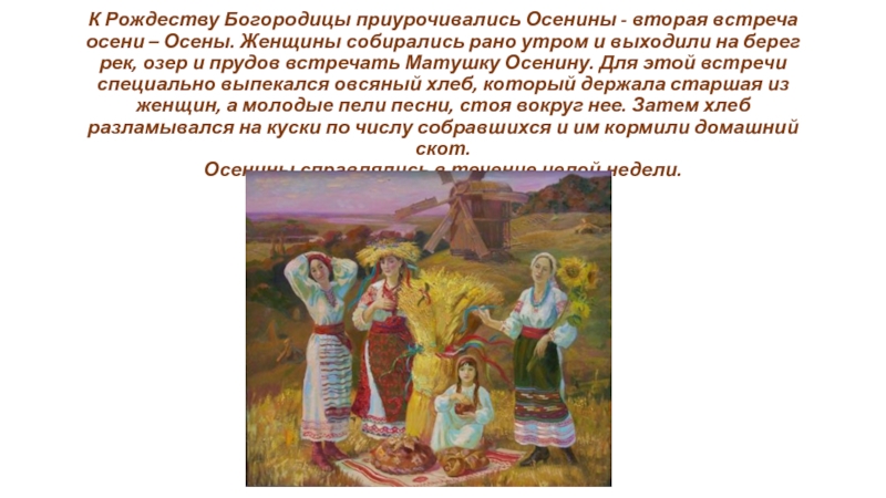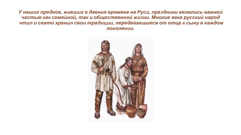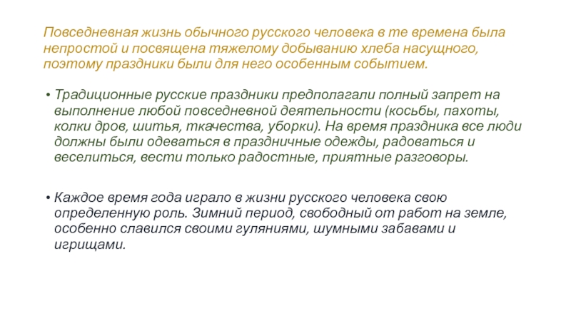Традиционные русские праздники предполагали полный запрет на выполнение любой повседневной деятельности (косьбы, пахоты, колки дров, шитья, ткачества, уборки). На время праздника все люди должны были одеваться в праздничные одежды, радоваться и веселиться, вести только радостные, приятные разговоры.