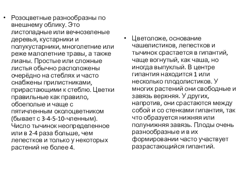 Цветоложе, основание чашелистиков, лепестков и тычинок срастается в гипантий, чаще вогнутый, как чаша, но иногда выпуклый. В центре гипантия находится 1 или несколько плодолистиков. У многих растений они свободные и завязь верхняя. У других, напротив, они срастаются между собой и со стенками гипантия, так что образуется нижняя или полунижняя завязь. Плоды очень разнообразные и в их формировании часто участвует разрастающийся гипантий.