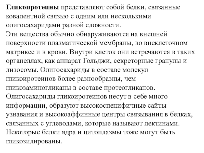 поверхности плазматической мембраны, во внеклеточном матриксе и в крови. Внутри клеток они встречаются в таких органеллах, как аппарат Гольджи, секреторные гранулы и лизосомы. Олигосахариды в составе молекул гликоиротеинов более разнообразны, чем гликозаминогликаны в составе протеогликанов. Олигосахариды гликоиротеинов несут в себе много информации, образуют высокоспецифичные сайты узнавания и высокоаффинные центры связывания в белках, связанных с углеводами, которые называют лектинами. Некоторые белки ядра и цитоплазмы тоже могут быть гликозилированы.