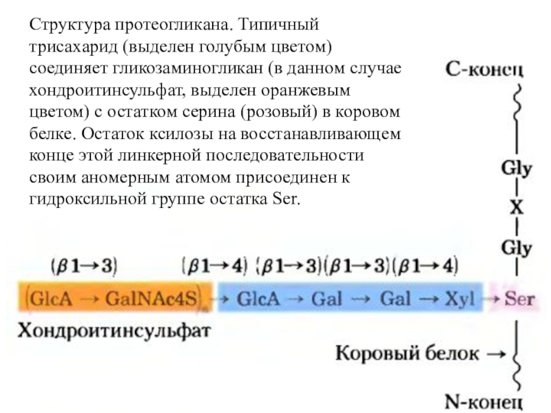 Слайд 41Структура протеогликана. Типичный трисахарид (выделен голубым цветом) соединяет гликозаминогликан (в