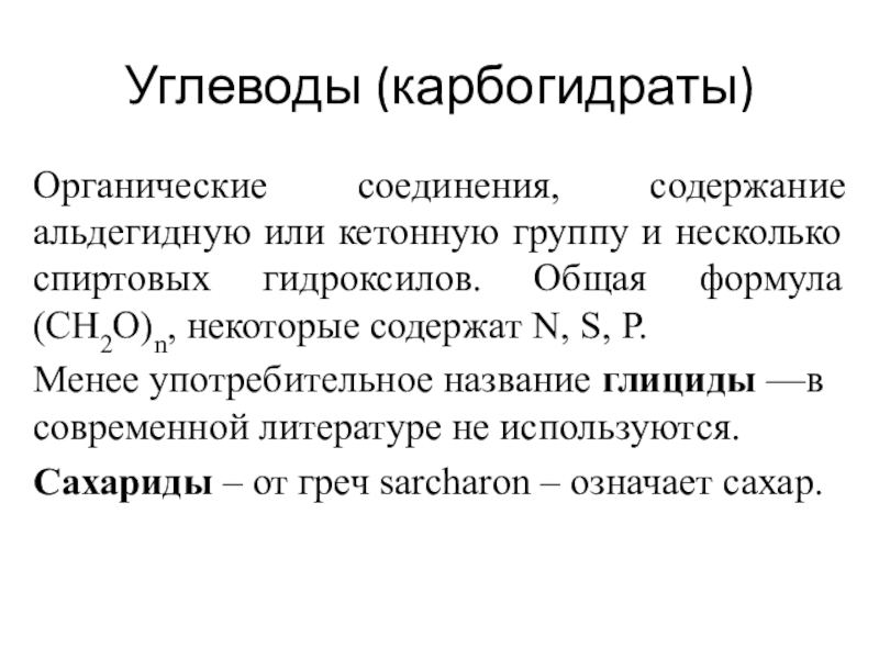 спиртовых гидроксилов. Общая формула (CH2O)n, некоторые содержат N, S, P.