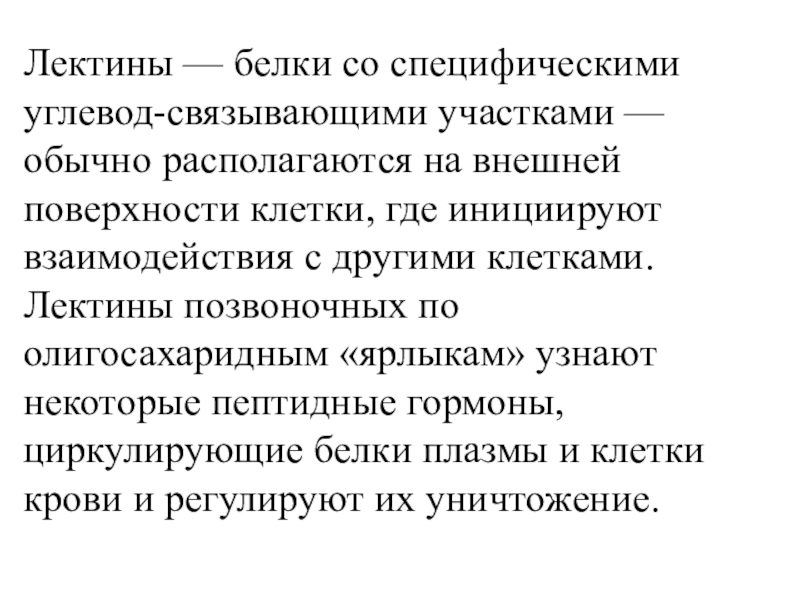 Лектины позвоночных по олигосахаридным «ярлыкам» узнают некоторые пептидные гормоны, циркулирующие белки плазмы и клетки крови и регулируют их уничтожение.