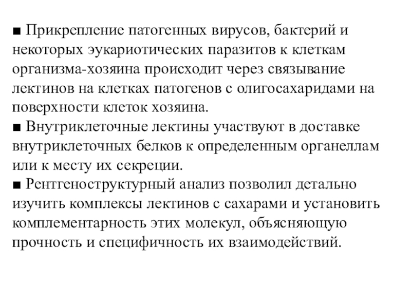 ■ Рентгеноструктурный анализ позволил детально изучить комплексы лектинов с сахарами и установить комплементарность этих молекул, объясняющую прочность и специфичность их взаимодействий.
