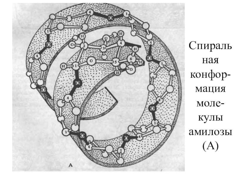 Слайд 23Спиральная конфор-мация моле-кулы амилозы (А)