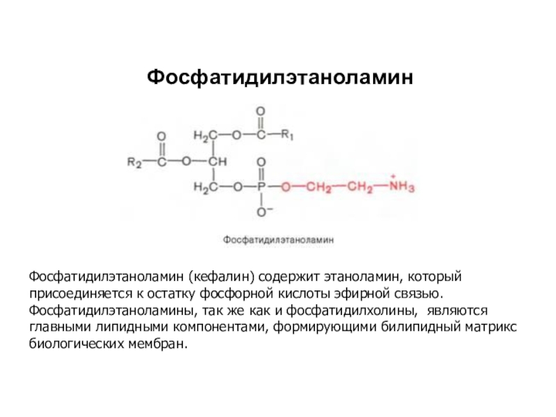 Фосфатидилэтаноламин (кефалин) содержит этаноламин, который присоединяется к остатку фосфорной кислоты