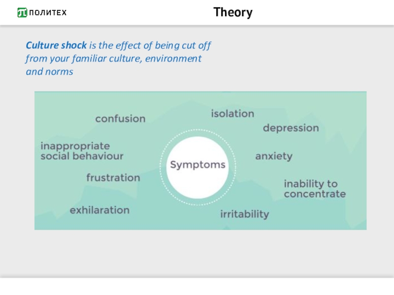 TheoryCulture shock is the effect of being cut off from your familiar culture, environment and norms