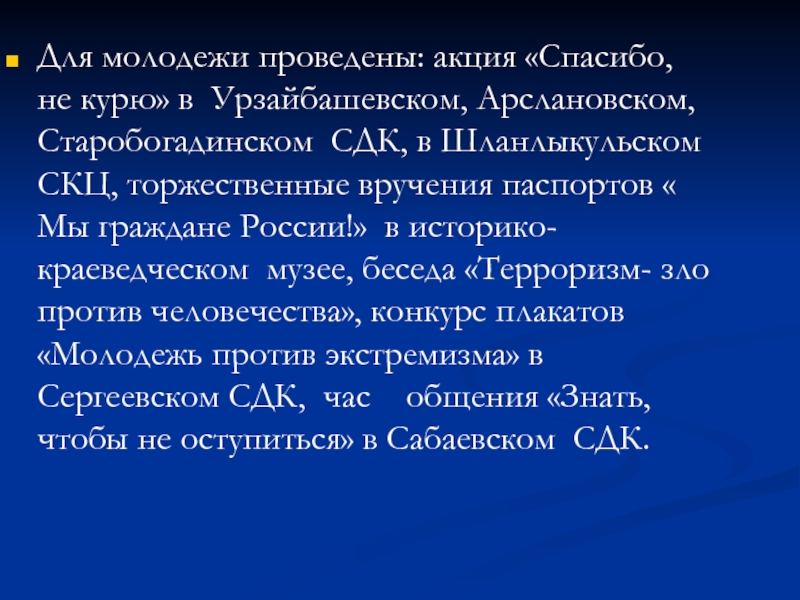 в Копейкубовском СДК, беседа «Помни! Курение приводит к ранней смерти» в Канлытуркеевском СДК, книжная выставка «Экстремизм и терроризм – угроза миру » в Киска-Елгинском СДК, конкурс на лучший плакат против сквернословия «За чистоту русского языка!» в Арслановском СДК, познавательная программа по правилам дорожной безопасности «Правила дорожного движения» в Уртакульском СДК