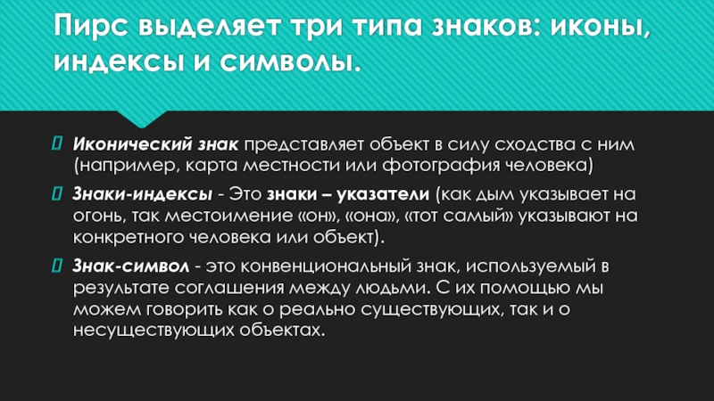 Слайд 4Пирс выделяет три типа знаков: иконы, индексы и символы.