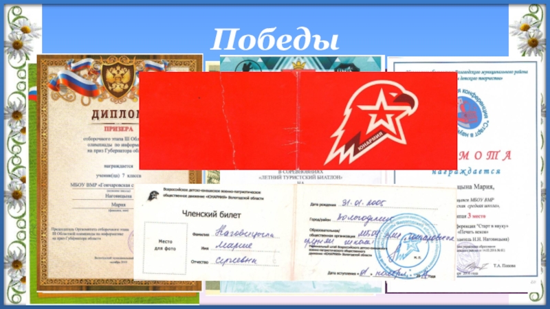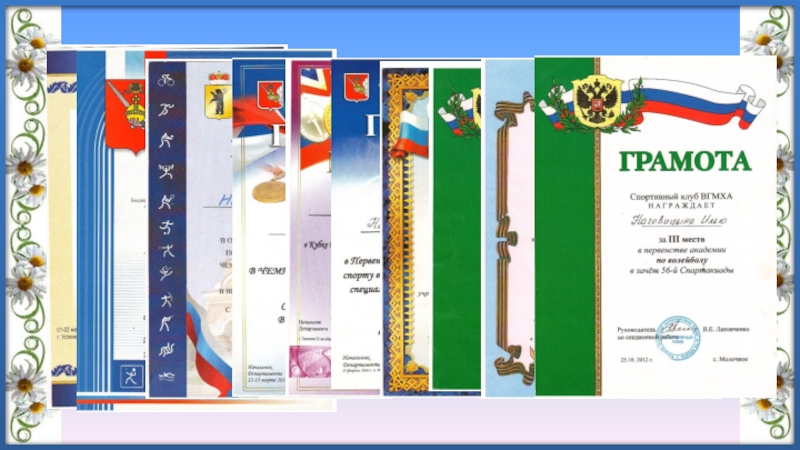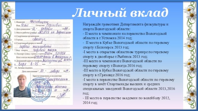 -I место в первенстве Вологодской области по гиревому спорту в зачёт Спартакиады высших и средних специальных заведений Вологодской области 2013,2016 год;