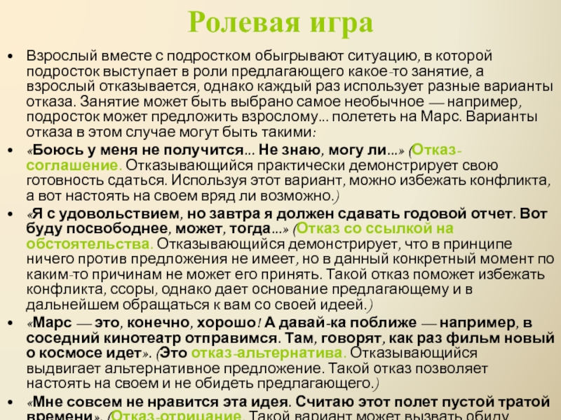 каждый раз использует разные варианты отказа. Занятие может быть выбрано самое необычное — например, подросток может предложить взрослому... полететь на Марс. Варианты отказа в этом случае могут быть такими: