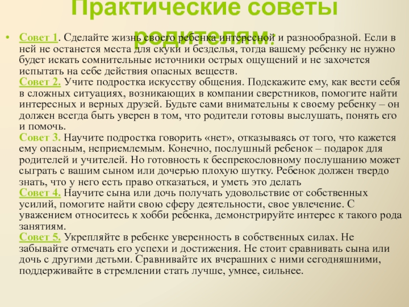 Совет 10. Убедите подростка в том, что не существует опасных и неопасных наркотиков: любой наркотик оказывает негативное воздействие на психику и физическое здоровье человека.