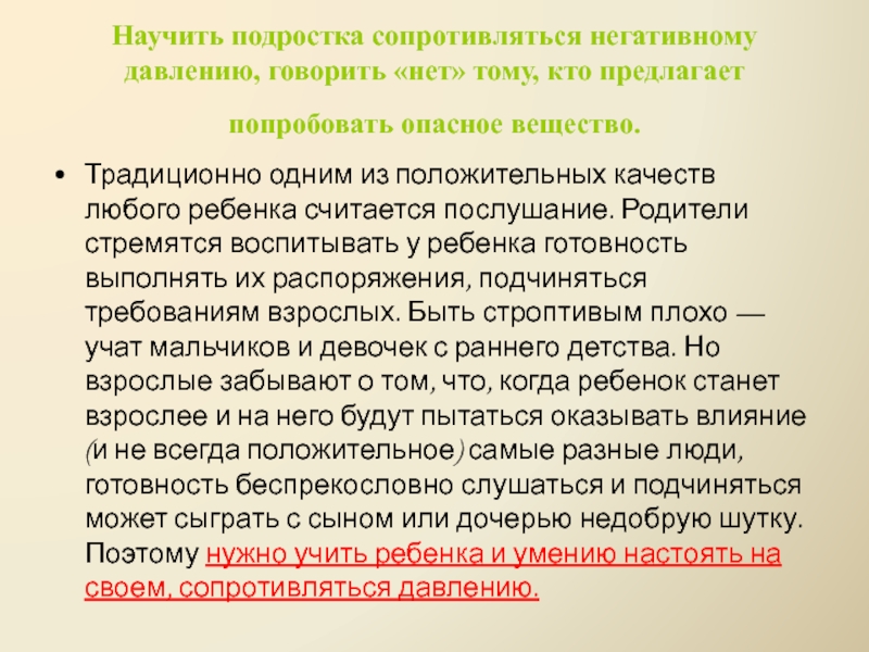 Слайд 14Научить подростка сопротивляться негативному давлению, говорить «нет» тому, кто предлагает