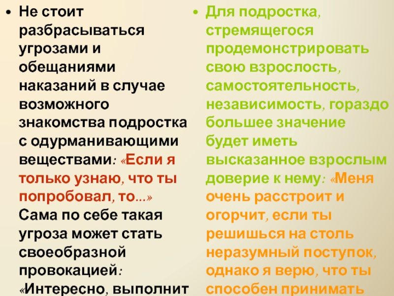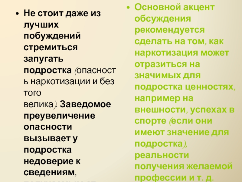 Слайд 9Не стоит даже из лучших побуждений стремиться запугать подростка (опасность наркотизации