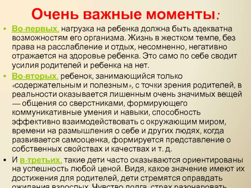 Во-первых, нагрузка на ребенка должна быть адекватна возможностям