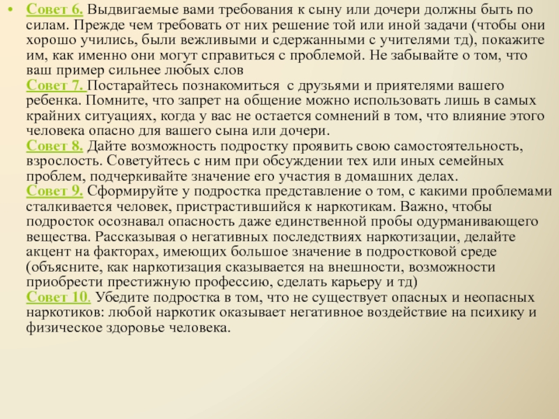Слайд 18Совет 6. Выдвигаемые вами требования к сыну или дочери должны быть