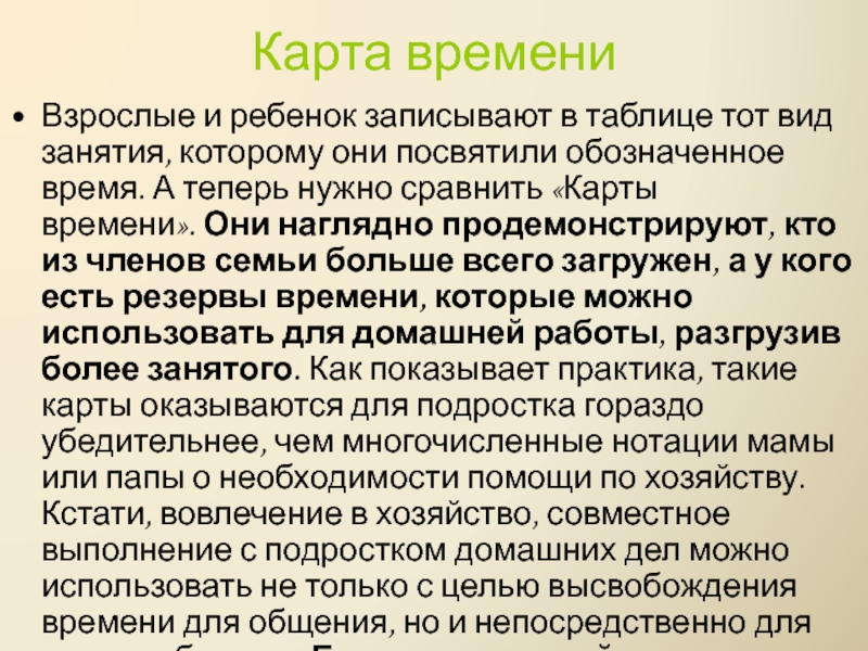 времени». Они наглядно продемонстрируют, кто из членов семьи больше всего загружен, а у кого есть резервы времени, которые можно использовать для домашней работы, разгрузив более занятого. Как показывает практика, такие карты оказываются для подростка гораздо убедительнее, чем многочисленные нотации мамы или папы о необходимости помощи по хозяйству. Кстати, вовлечение в хозяйство, совместное выполнение с подростком домашних дел можно использовать не только с целью высвобождения времени для общения, но и непосредственно для самого общения. Беседа за чисткой картошки, совместный поход за покупками могут оказаться ничуть не менее интересными, чем беседа за чайным столом.