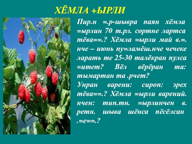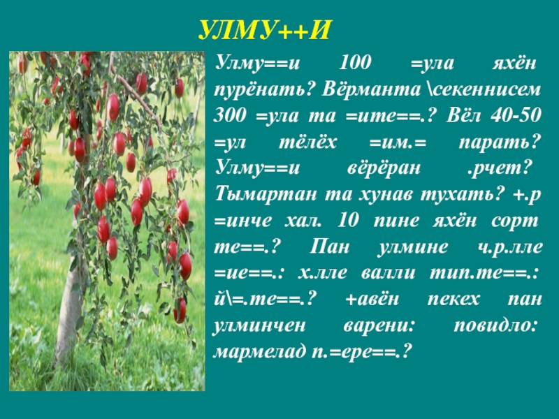 Тымартан та хунав тухать? +.р =инче хал. 10 пине яхён сорт те==.? Пан улмине ч.р.лле =ие==.: х.лле валли тип.те==.: й\=.те==.? +авён пекех пан улминчен варени: повидло: мармелад п.=ере==.?