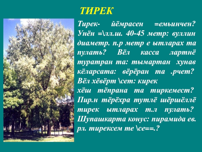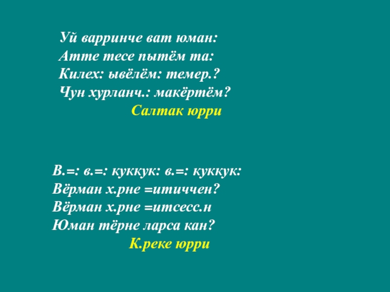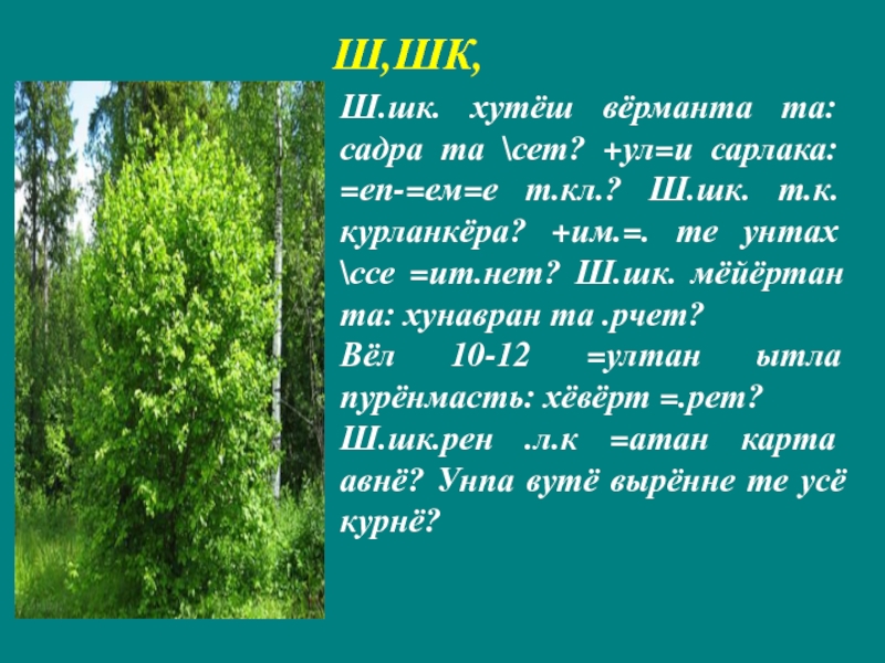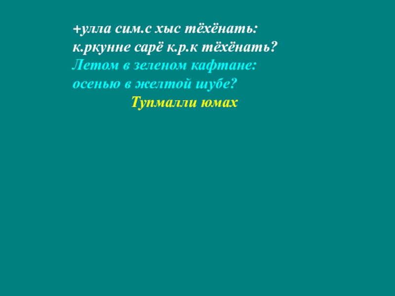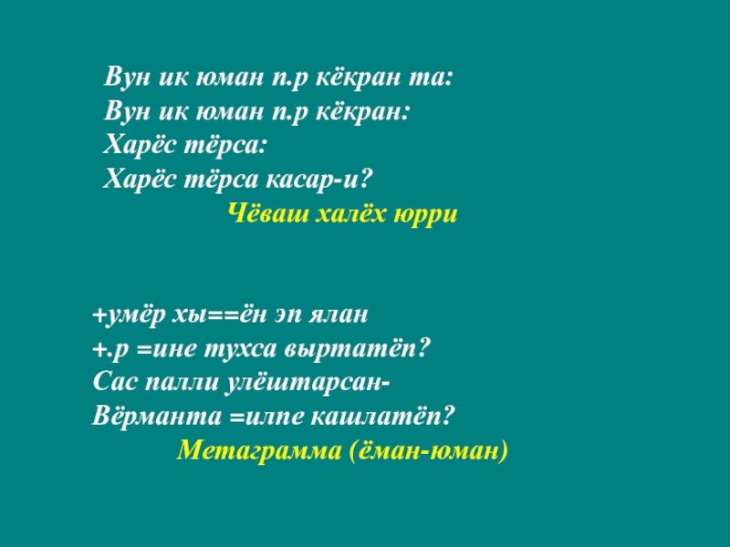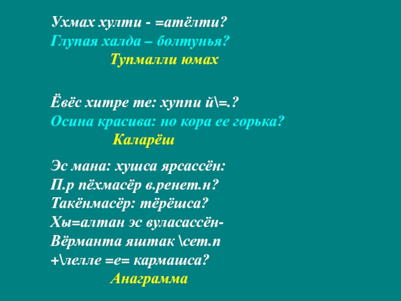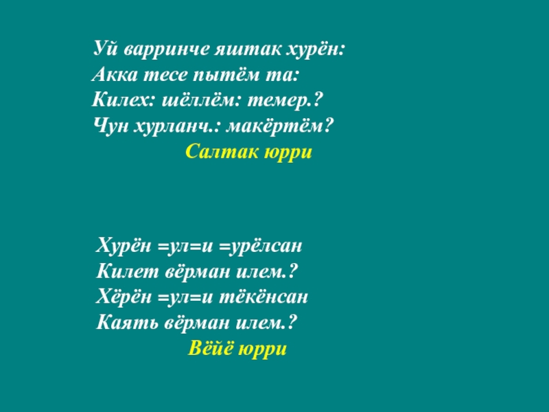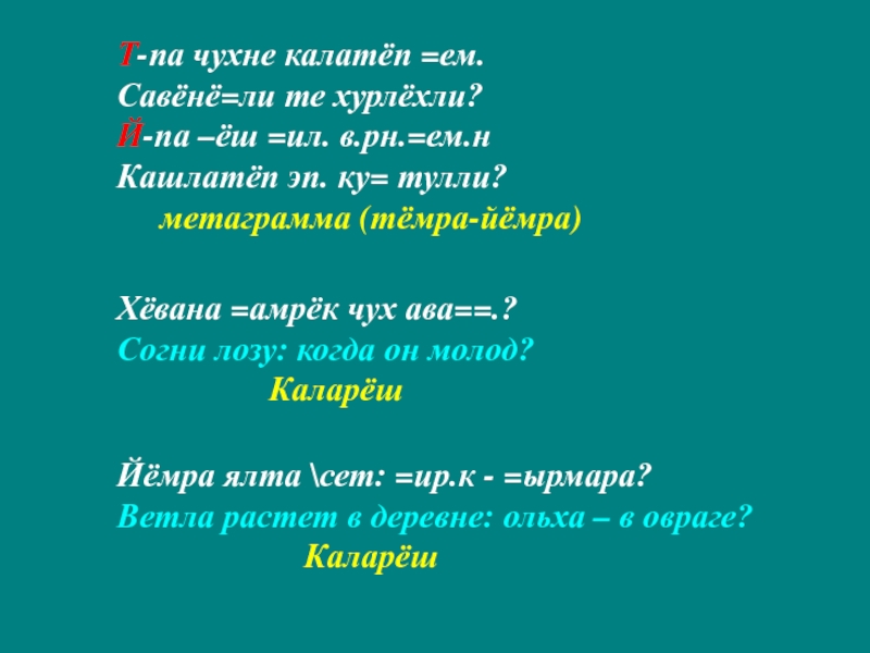 пурёнать? +ул=исем =утё хёмёр: хура хёмёр т.сл.? Чечек. вёрём хёлха =акки ев.рл.? Ёвёслёха пакша иленет: йывё= хёвёл.нче т.рл. кайёк йёва =авёрать: хуппине мулкач юратать? Тип. ёвёсран пураланё п\рт =ир.п?