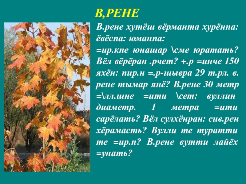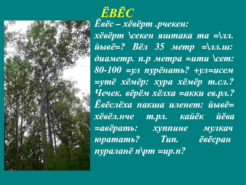 вёрёран: хунавран .рчет? Ытларах н\р. вырёнсенче т.л пулать? Ёстасем унран ч.нт.рл. те т.р.лл. с.тел-пукан: арча тунё? +ир.к вутти х.р\: лайёх =унать? +ир.кл.хре мулкачсем: пёчёрсем пурёна==.: ула такка: чакак: пилеш кайёкне асёрхама пулать?