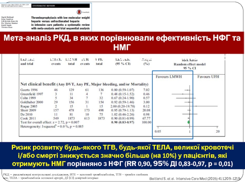 Слайд 28Мета-аналіз РКД, в яких порівнювали ефективність НФГ та НМГ