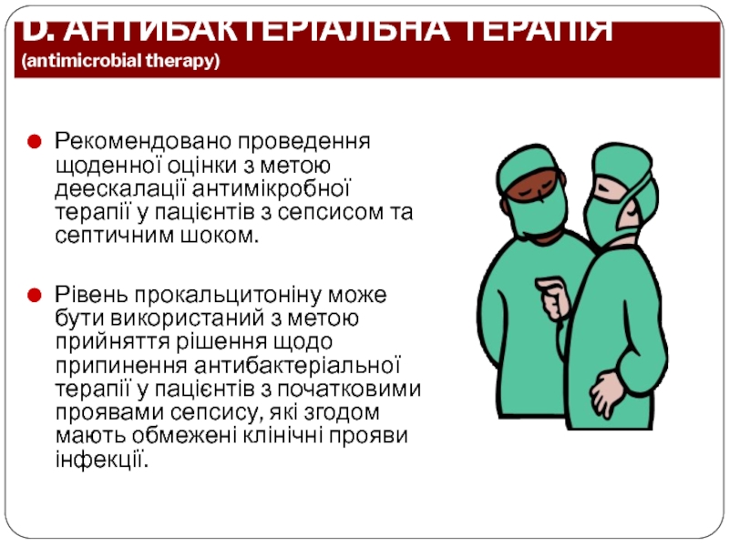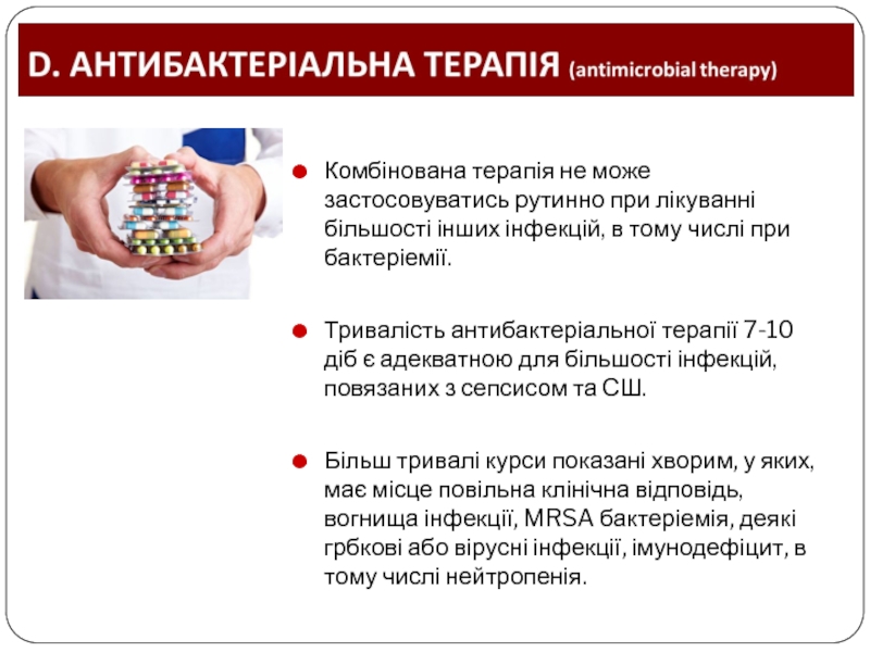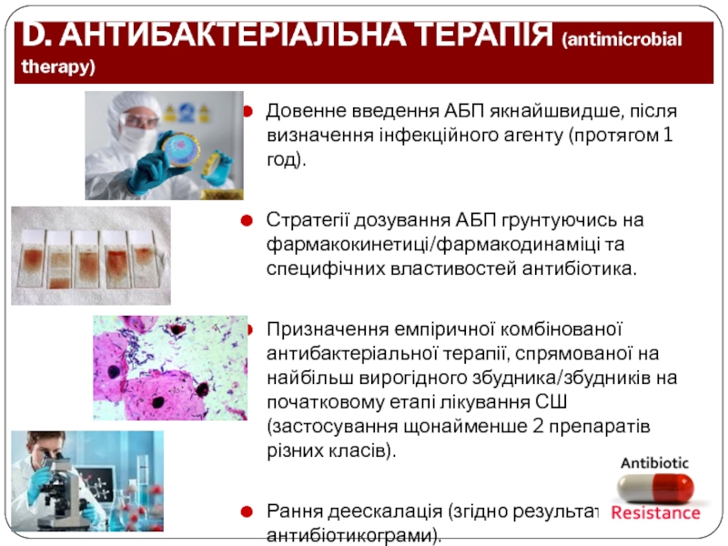 Слайд 8D. АНТИБАКТЕРІАЛЬНА ТЕРАПІЯ (antimicrobial therapy)