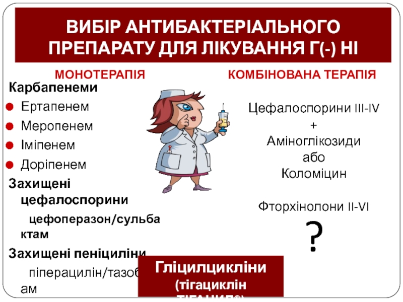 Слайд 13ВИБІР АНТИБАКТЕРІАЛЬНОГО ПРЕПАРАТУ ДЛЯ ЛІКУВАННЯ Г(-) НІ