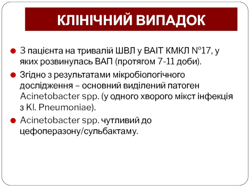 дослідження – основний виділений патоген Acinetobacter spp. (у одного хворого мікст інфекція з Kl. Pneumoniae).