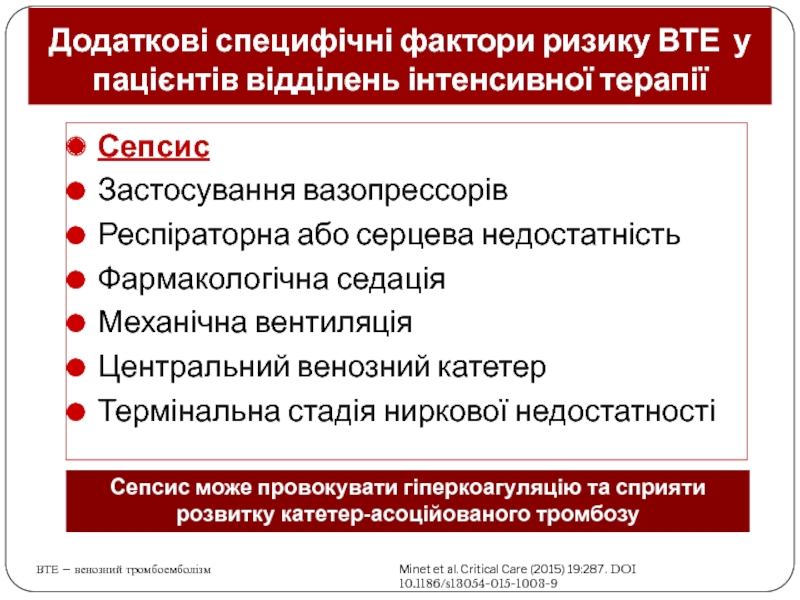 Слайд 26Додаткові специфічні фактори ризику ВТЕ у пацієнтів відділень інтенсивної терапії
