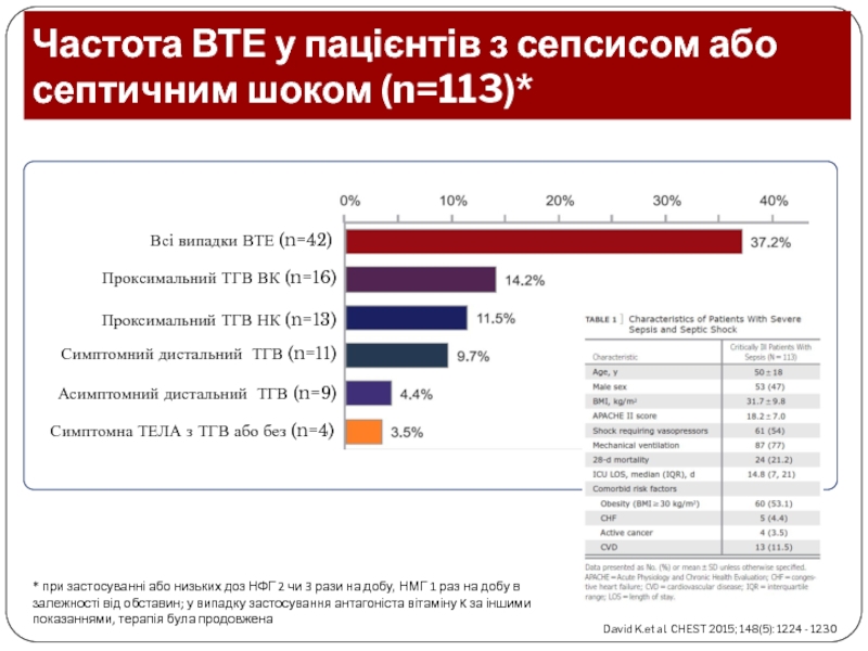 Слайд 27Частота ВТЕ у пацієнтів з сепсисом або септичним шоком (n=113)*