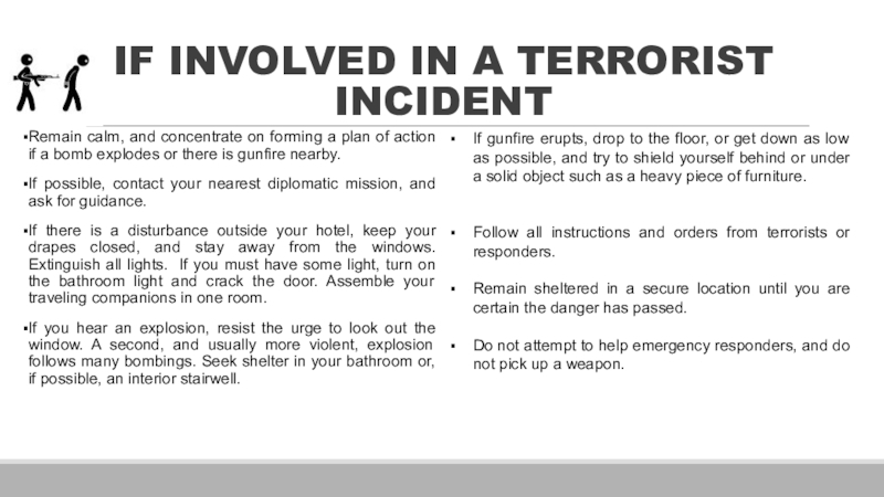 A second, and usually more violent, explosion follows many bombings. Seek shelter in your bathroom or, if possible, an interior stairwell.