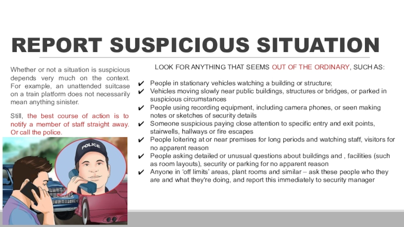 Anyone in ‘off limits’ areas, plant rooms and similar – ask these people who they are and what they're doing, and report this immediately to security manager