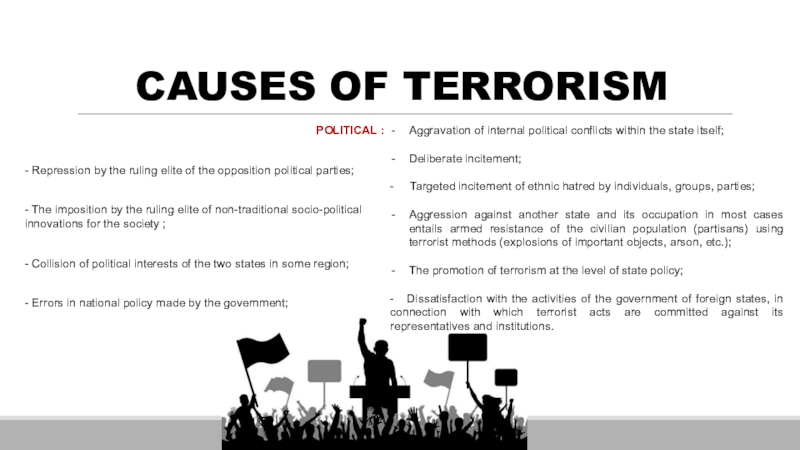 - Dissatisfaction with the activities of the government of foreign states, in connection with which terrorist acts are committed against its representatives and institutions.